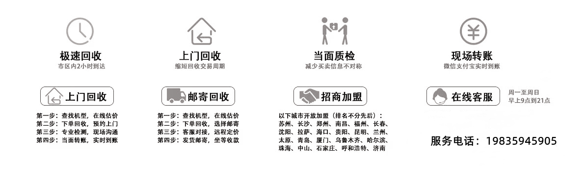 碳枢屿回收专注苹果设备回收,具有完善的产业链,平台一直以客户利益最大化为宗旨,严格遵守规范的、合理的估价流程,为客户提供优质的回收服务。关于价格敏感问题,支持多平台估价方式,以切身行动为客户提供福利。在疫情期间,碳枢屿回收支持北京、上海、深圳、广州、西安、佛山、东莞、苏州、天津等地的上门回收服务,实现在家快速安全变现。